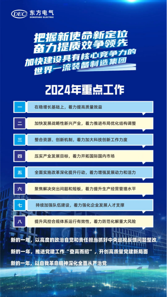 俞培根指出,2024年是落实“领先战略”和“11256”发展战略,推进集团公司转型发展的关键之年,做好全年的工作尤为重要。全集团要坚持以席大大新时代中国特色社会主义思想为指导,全面贯彻落实党的二十大和二十届二中全会、中央经济工作会议精神,深入贯彻落实席大大总书记关于国有企业改革发展和党的建设重要论述,认真贯彻落实席大大总书记“弘扬可贵的‘东汽精神’”“做排头兵、走在前列”的重要要求,把握国资央企新使命新定位,完整、准确、全面贯彻新发展理念,更好服务加快构建新发展格局、推进新型工业化,坚持稳中求进、以进促稳、先立后破,增强核心功能、提高核心竞争力,落实“领先战略”,强化创新驱动,提升经济效益,持续推动集团公司高质量发展,实现生产经营质的有效提升和量的合理增长,加快建设具有核心竞争力的世界一流装备制造集团。